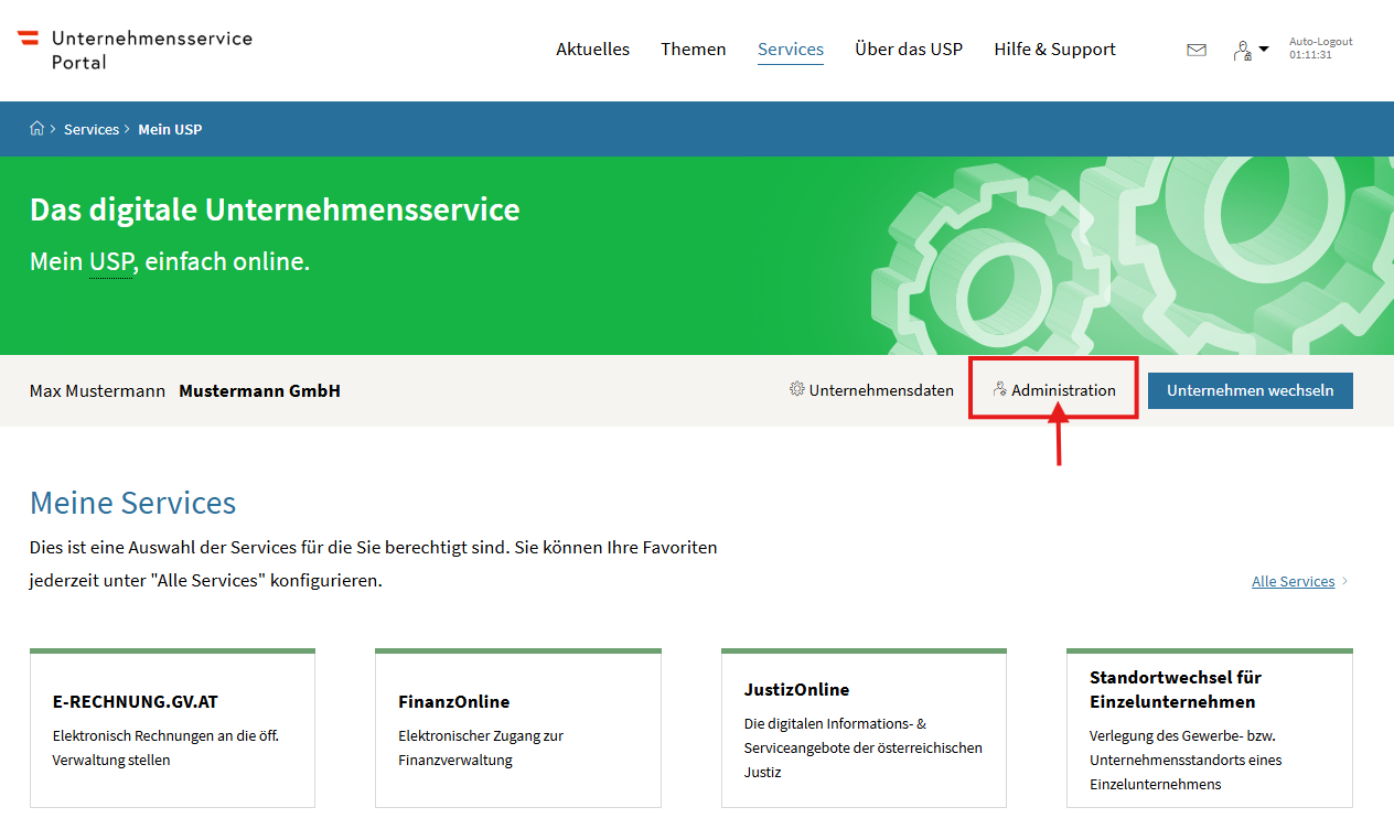 Alle auf dieser Seite beschriebenen Schritte setzen voraus, dass Sie in Mein USP für das zu administrierende Unternehmen angemeldet sind und dass Sie die Administration geöffnet haben.