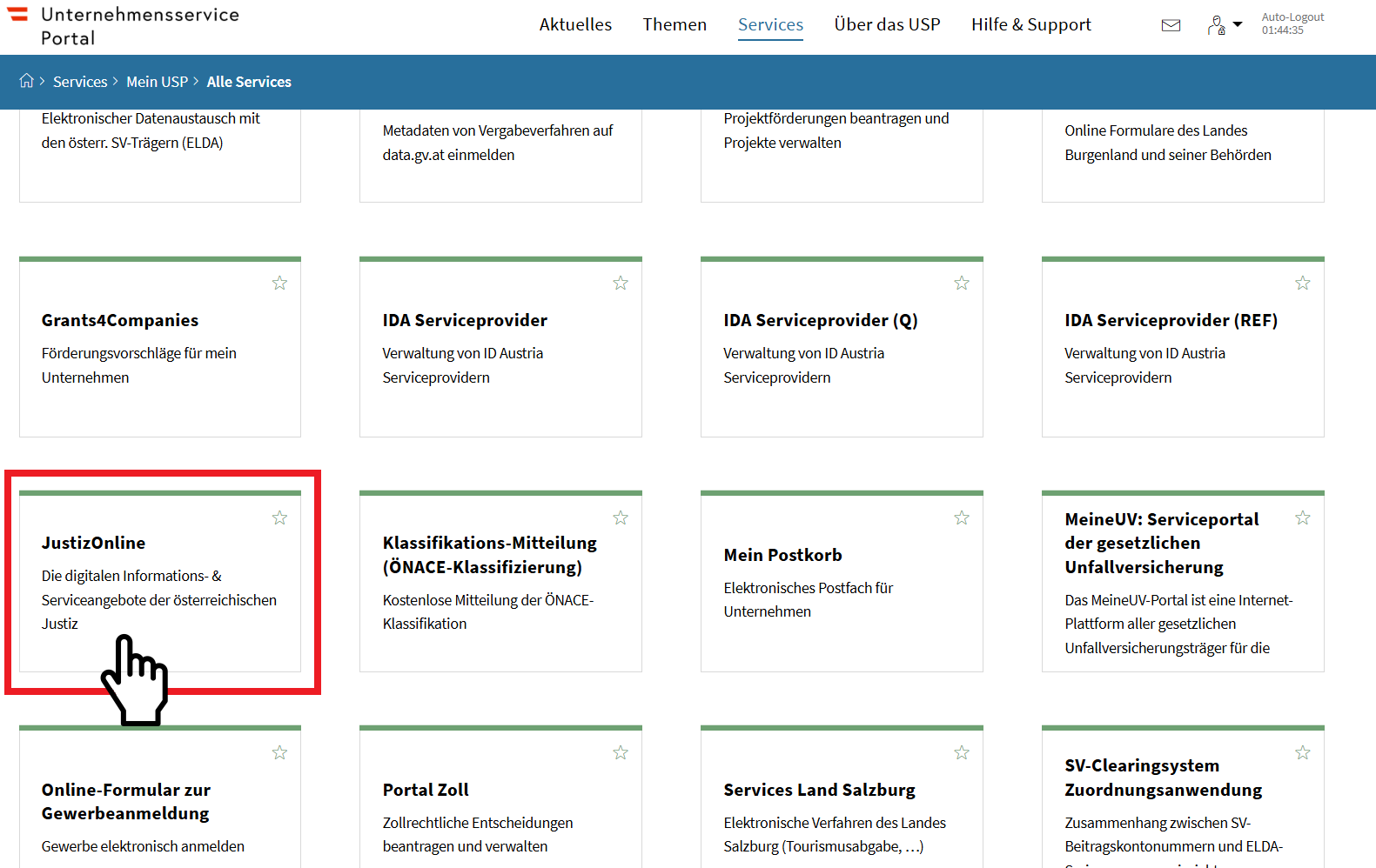 Sollten Sie JustizOnline nicht auf Ihrer Mein USP-Startseite sehen, klicken Sie bitte auf „Alle Services“, um die vollständige Liste aller für Sie freigeschalteten Services anzuzeigen. Wählen Sie dort „JustizOnline“ aus.